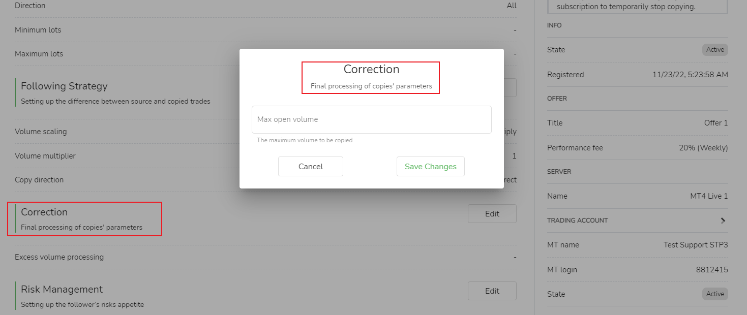 • The correction sets the maximum amount of copied trades that will eventually be executed. CopyTrading's follower can not only control the risk of the trading position of the signal source, but also control the risk of the size of the position they should place.