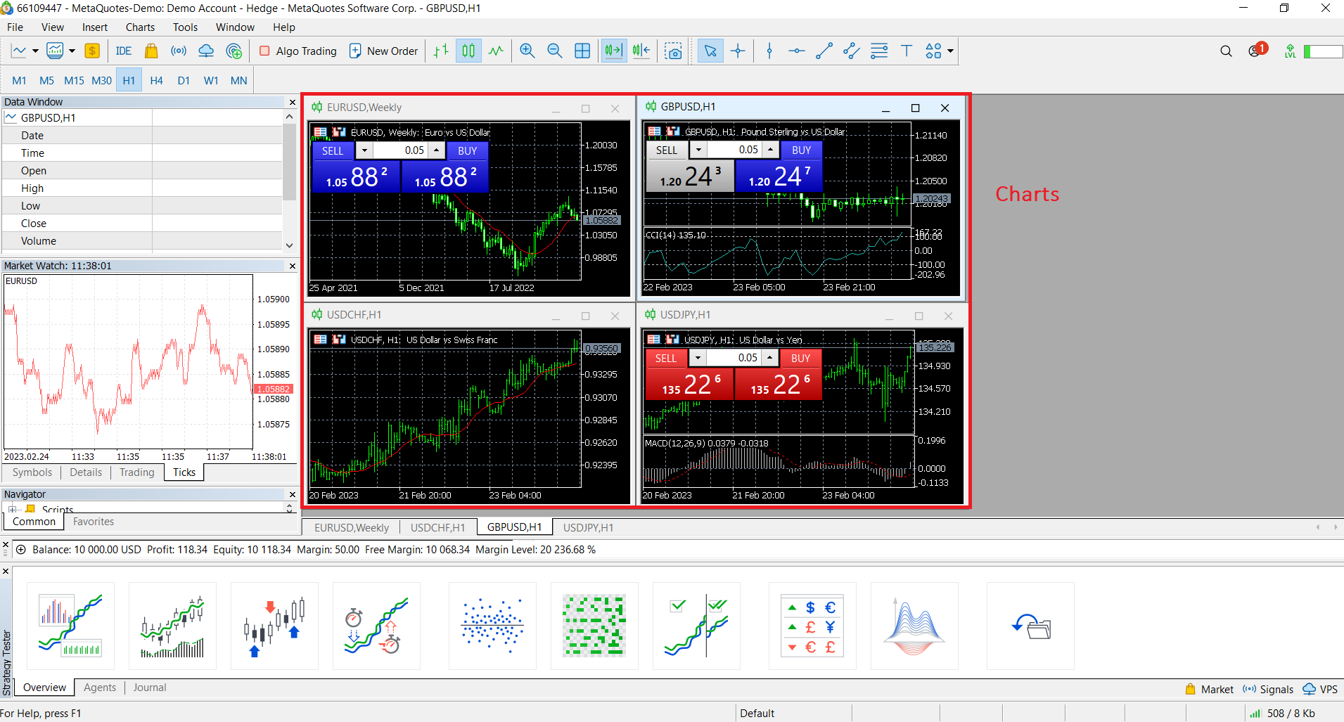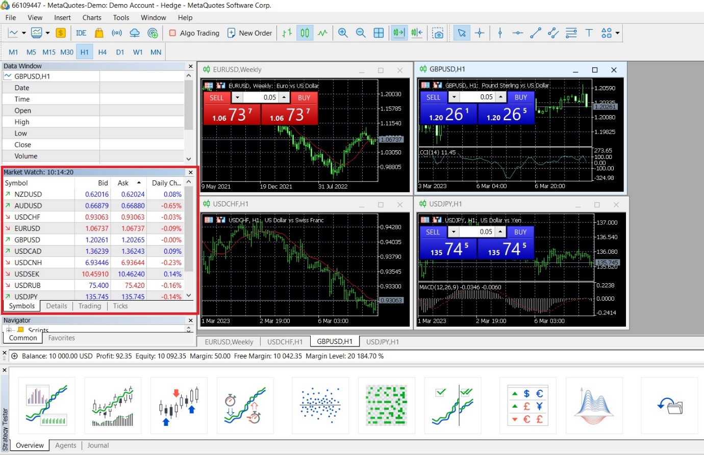 Commonly used or key functions in the main menu are located in the toolbar, which is convenient for users to quickly operate, such as searching for trading symbols, placing orders, adjusting chart types and adding graphical indicators, etc.
