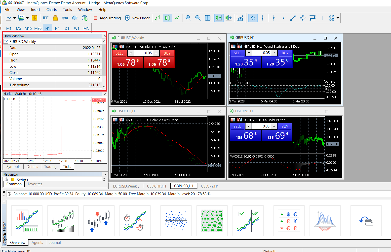 If the mouse cursor stays on a certain time node on the chart, then the detailed transaction data of that time node will be displayed in the 【Data Window】.