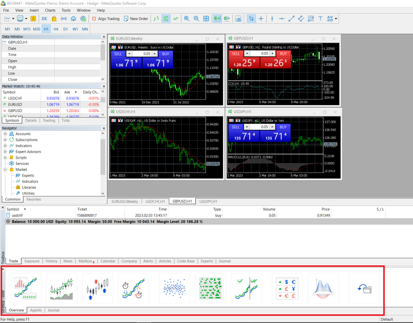 The main menu includes almost all functions in MT5, which help users to perform chart operations, tool analysis and platform settings, etc. The main menu consists of the main functions of [File], [View], [Insert], [Chart Tools], [Window] and [Help].
