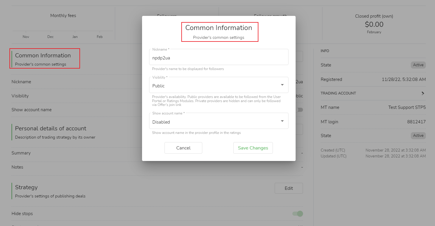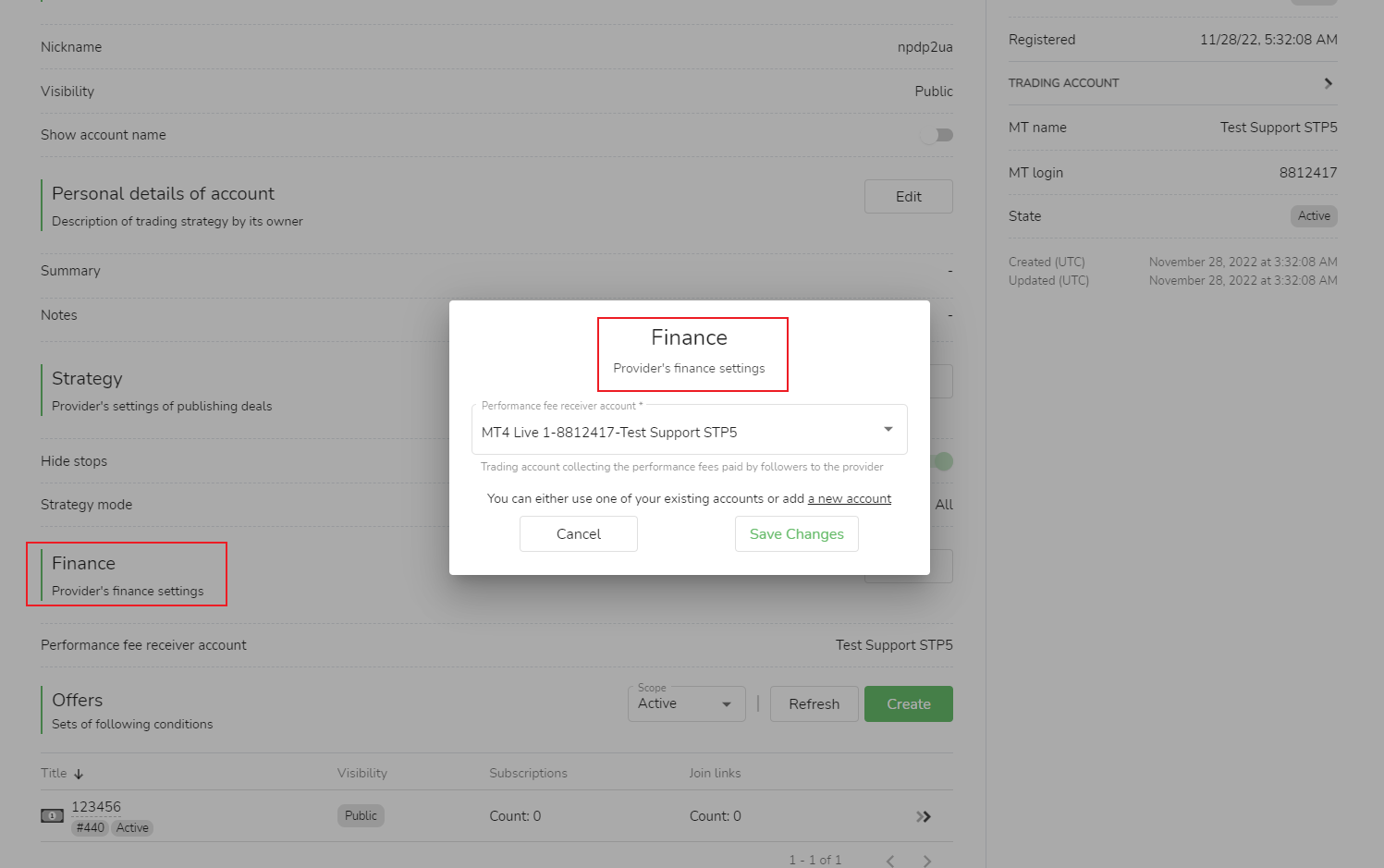 Cuenta de aceptación de comisión por rendimiento:La cuenta comercial que la fuente de la señal recopila seguidores para pagar tarifas de rendimiento a la fuente de la señal puede elegir una cuenta existente o agregar una nueva cuenta. En el proceso de agregar una nueva cuenta, debe completar la cuenta comercial (es decir, el cuenta comercial en MetaTrader) y la contraseña (es decir, la contraseña de transacción de MetaTrader) y luego haga clic en [Guardar cambios] para completar la configuración correctamente.