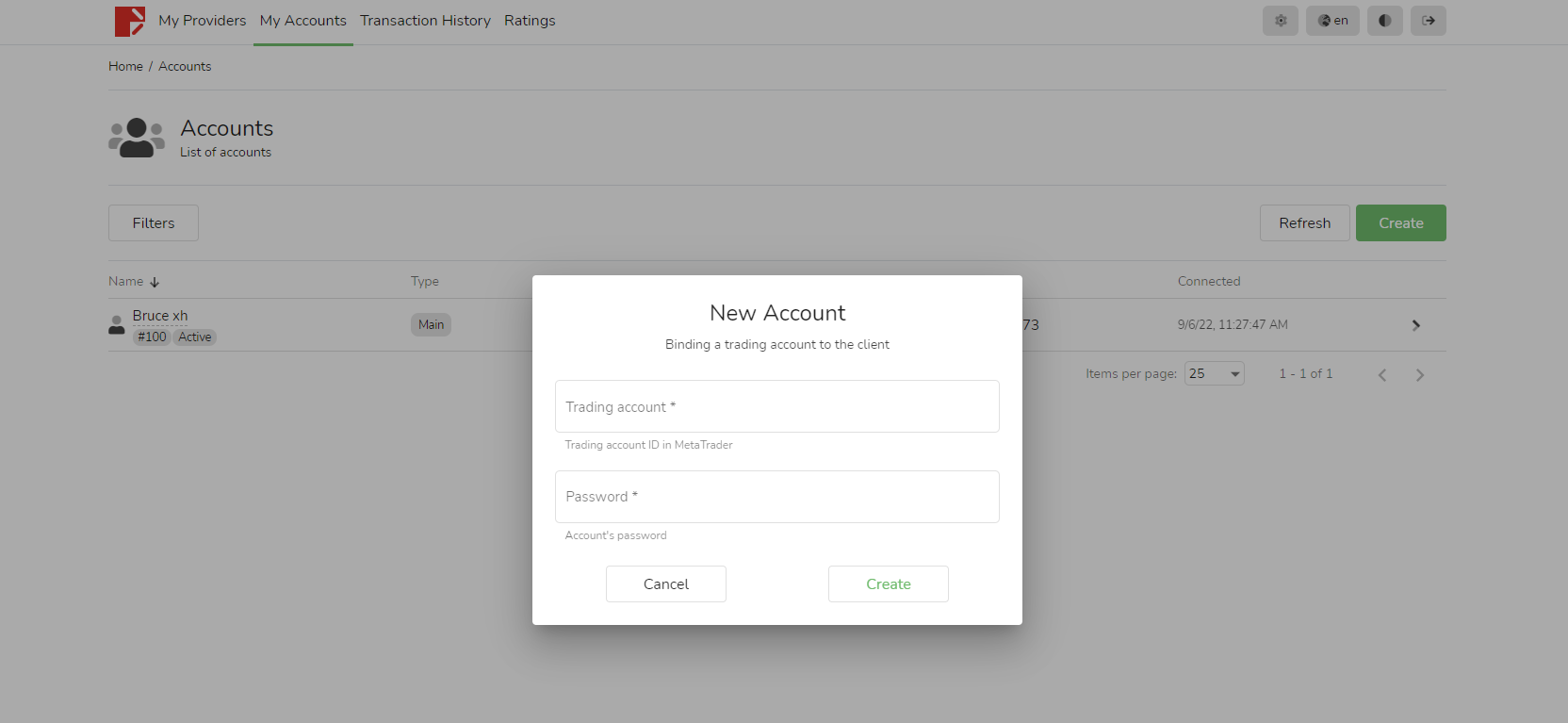 1. CopyTrading에 로그인하고 "내 계정" 열에서 오른쪽에 있는 녹색 버튼 "만들기"를 클릭하십시오.