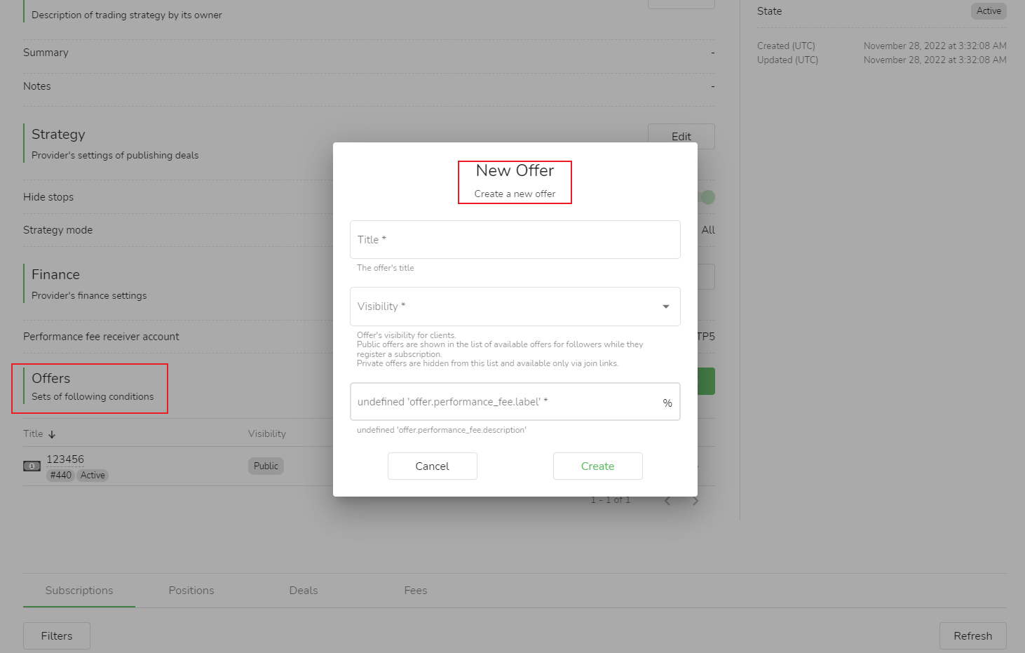 새로운 시그널 소스 생성이 완료되면 [제목], [전략], [성과수수료 계정]을 설정하고 [복사 조건]을 생성할 수 있습니다.