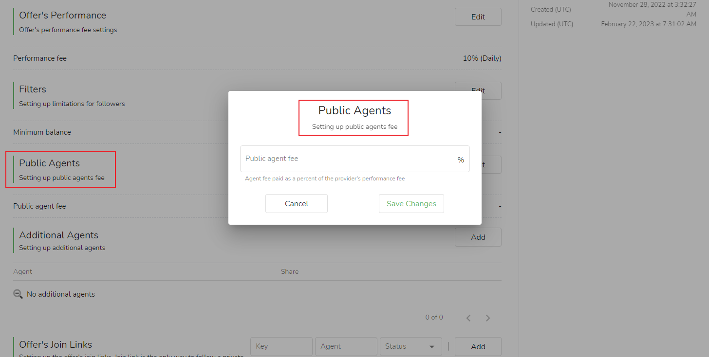 Taxa de Indicação = Taxa de Desempenho * Porcentagem da Taxa de Indicação (paga aos Promotores vinculados aos Seguidores).