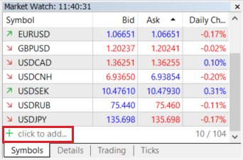 1. Adicione o código do símbolo de negociação relevante diretamente na janela de cotação de mercado:
