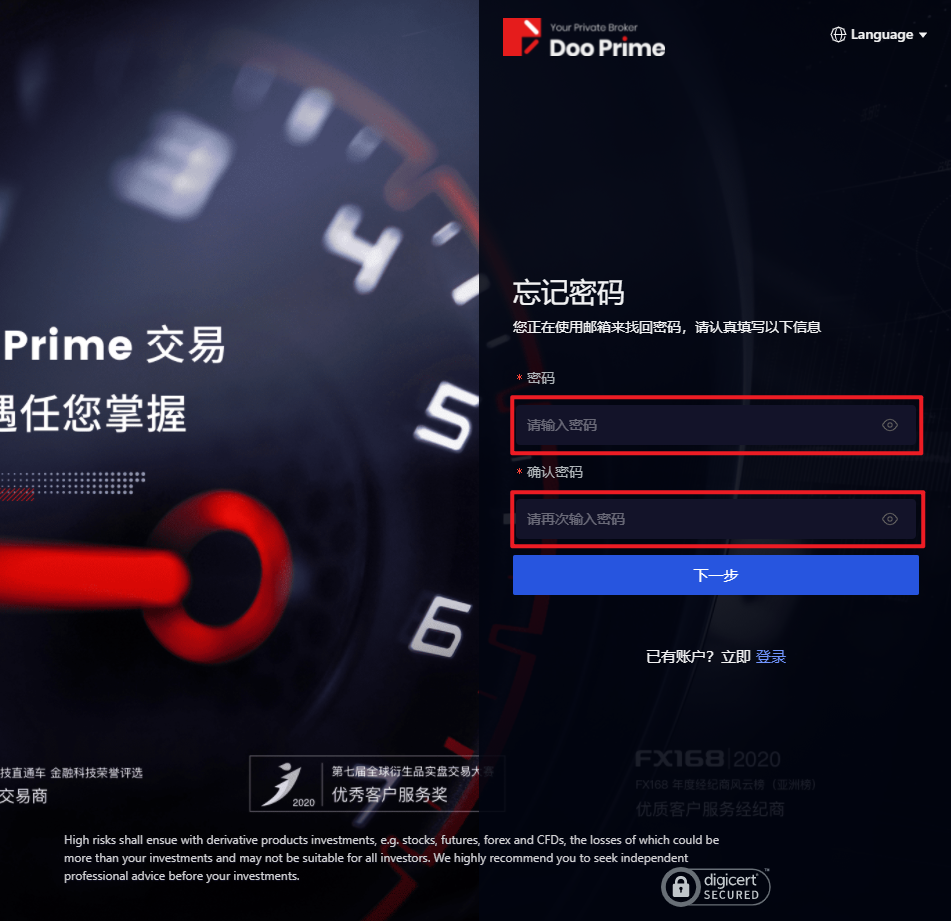 3. 頁面會跳至「忘記密碼」介面,重設D Prime 用戶中心的帳號密碼,點選「下一步」。